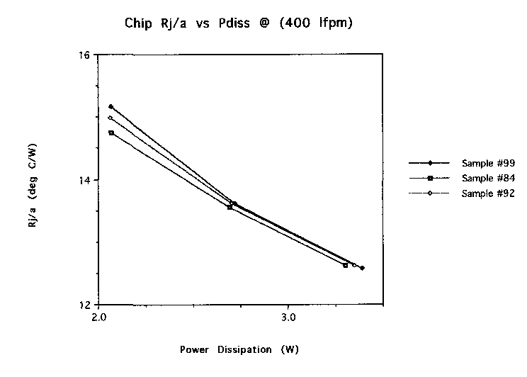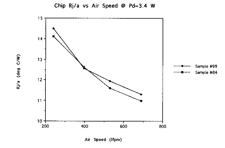 Figure One shows the close agreement of the three tested chips. These plots show that test data for one chip should be valid for all chips. Figure Two is very useful in that it shows Rj/a decreasing with increasing air velocity. A point is usually reached where increasing the air velocity does not decrease this value. This plot is valuable since it shows there is room to improve the heat transfer if the design requires by increasing the air velocity. It is reasonable to expect that one more velocity increment (150 lfpm to 850 lfpm) would produce linearly reduced resistances. However, increasing the air velocity comes at the expense of greater fan size, greater fan energy costs, and increased noise.