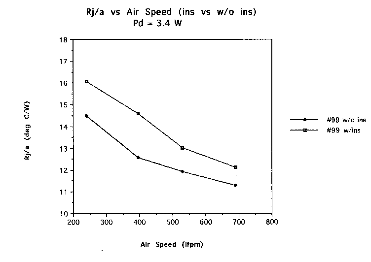 Figure Three displays the significantly higher Rj/a values with the PCB backside insulated. This shows that the backside heat transfer surface is significant to the overall chip operating temperature. The junction temperatures were between 2.8·C at 700 lfpm to 5.3·C at 250 lfpm higher with the insulation. This test was worth doing because the chip package is a cavity up one where the die is much closer to the package bottom. And the PCB design is one where the heat is primarily to be removed from the package top. This test has shown that improvements could be made to the chip bottom side heat transfer if required.