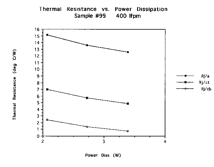Figure Four shows the relative scale of the thermal resistances (Rj/a, Rj/ct, and Rj/cb) versus power dissipation. They decrease with increasing power dissipation as would be expected. This plot could be used as a reference to scale when determining a resistance at a point that was not tested for. Also, the resistances from the junction to case top (Rj/ct) can be used to determine actual junction temperatures if accurate convection coefficients are determined.