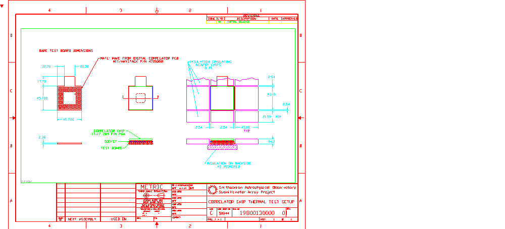 To further simulate the actual conditions a scrap digital correlator PCB was supplied from Haystack. The PCB was cut to the size of one correlator chip with a small tab left for mounting. The actual socket used was soldered in and the chip mounted as it would be in actual service. The tab was screwed into the Analysis Techs test adapter board which fits into the wind tunnels connector. To simulate the chip under test as being in the middle of a PCB, a foam air block was made. Using the actual correlator board and socket eliminates guessing how closely the test setup matches the through the board thermal conductivity. The correlator test board and foam air dam are detailed in SMA drawing number 19800130000 (included in Appendix B). All thermal resistance measurements were taken with the foam air dam mounted on the test board.