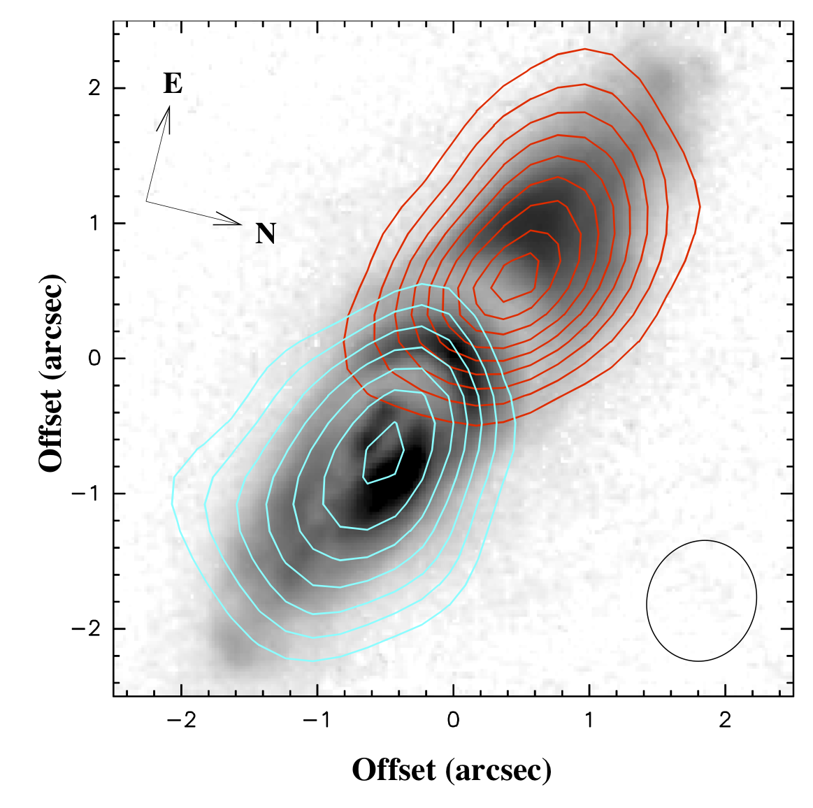 Figure 1: Map of CO 3-2 emission showing the red and blue wings of the outflow in IRAS 22036+5306, overlaid on a 0.6 micron HST image (Sahai et al. 2006). |