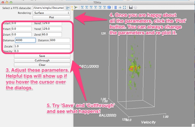 Here you can select your own FITS files. After you select one, the starting and ending pixels in three axes, and the maximum and minimum values will be updated respectively depending on properties of your datacube. So the default scene plotted will be the entire datacube. If you want to focus on a smaller region and a narrow velocity range, you can change these values and click the ‘Plot’ button again.